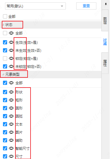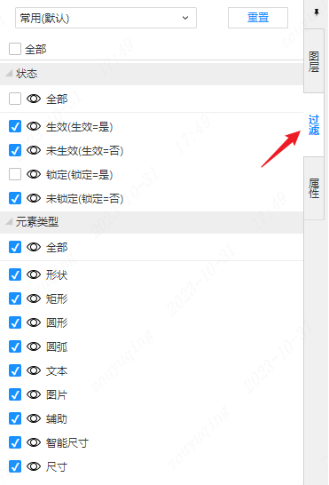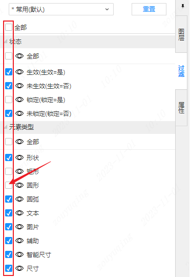 设定筛选条件可以通过单击选项标签来选择或取消对应的选项。取消过滤类型名称前面的勾选后则在画布上无法单击或框选选中,勾选时则可在画布上选中。
