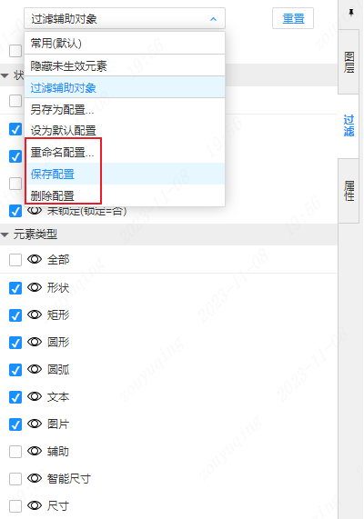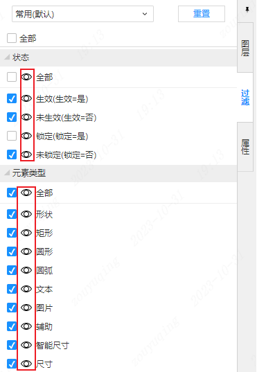 点击旁边的小眼睛,将在画布上批量隐藏对应类型的元素。
