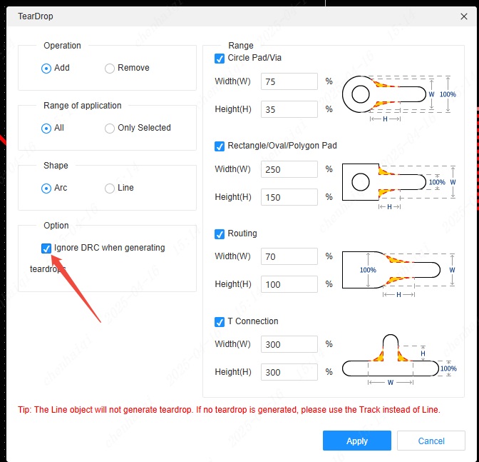 DRC reports an error and cannot add teardrops. You can choose to ignore DRC in the settings.