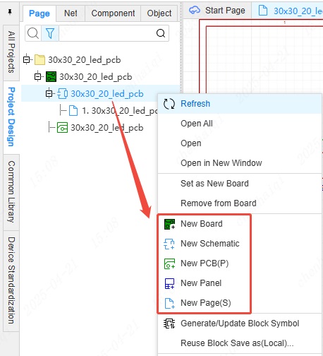In the top menu - New - Board, a new board, schematic, PCB will be created automatically, at which point multiple board designs can be supported.