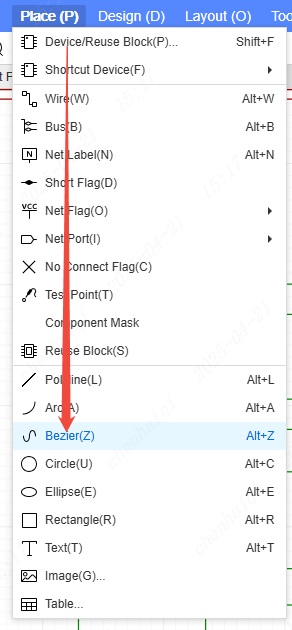 The tool ‘Bezier’ for drawing curves can be found in the top menu bar under ‘place’.Note that curves cannot be used as wires to connect pins.