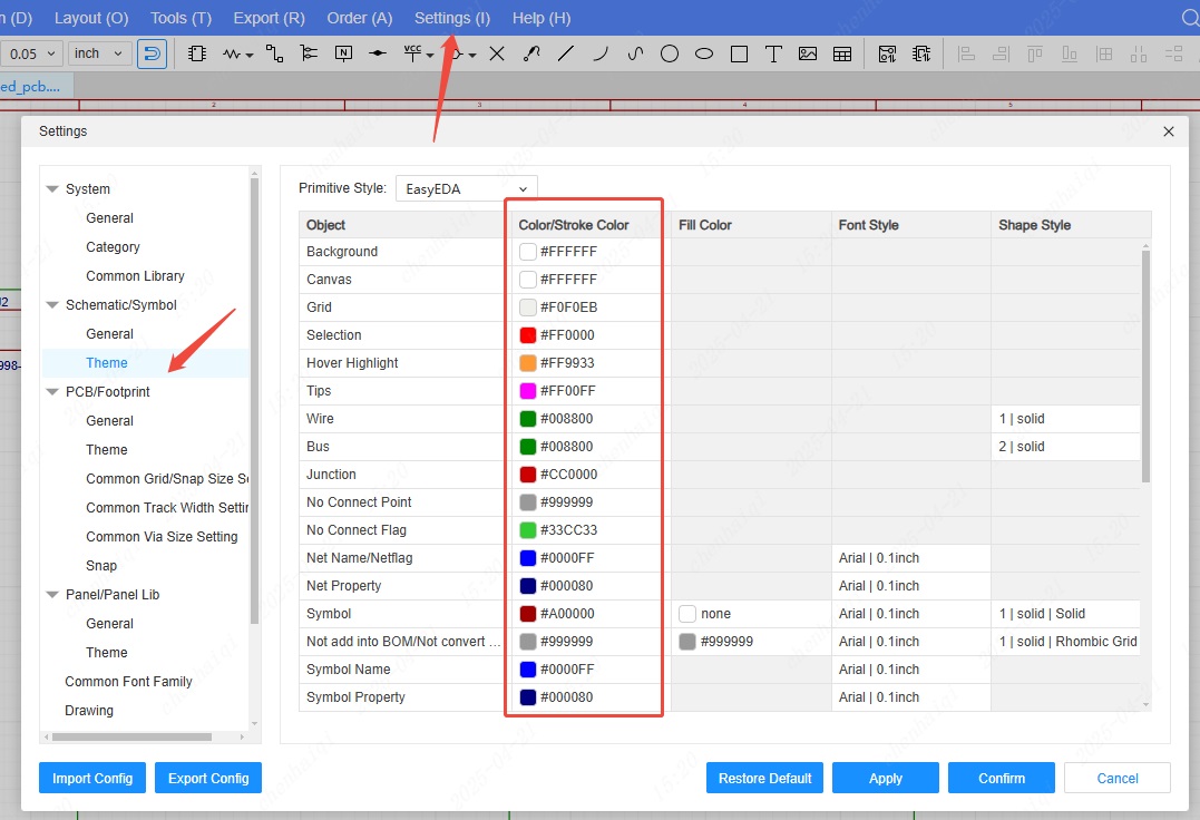 Select ‘Schematic/Symbol’ from ‘Settings’ in the top menu bar to enter the ‘Theme ‘Setting, you can modify the canvas color of the schematic as well as the colors of other settings.