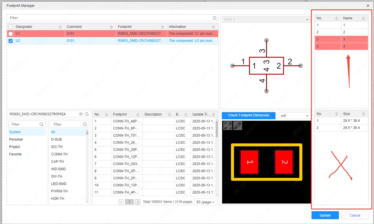 The symbol's pins must match the footprint's pad numbers. You can check if the device matches correctly in the footprint manager. Enter the package manager and you can see that the number of symbol pins is not consistent with the number of pads on the footprint.We can replace them with other footprints on the right side.